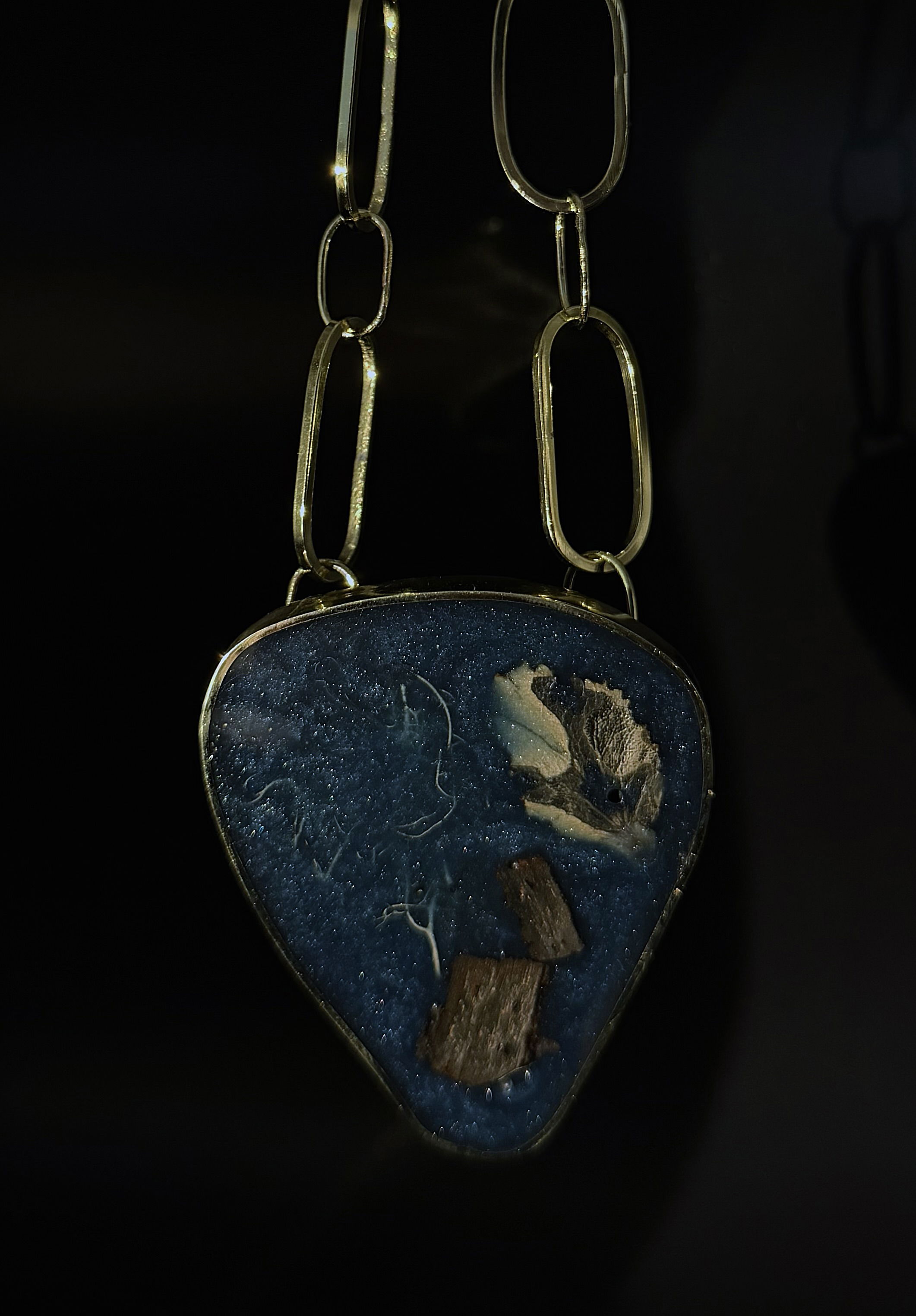 Pieza única hecha a mano en bronce, resina, madera y liquen.