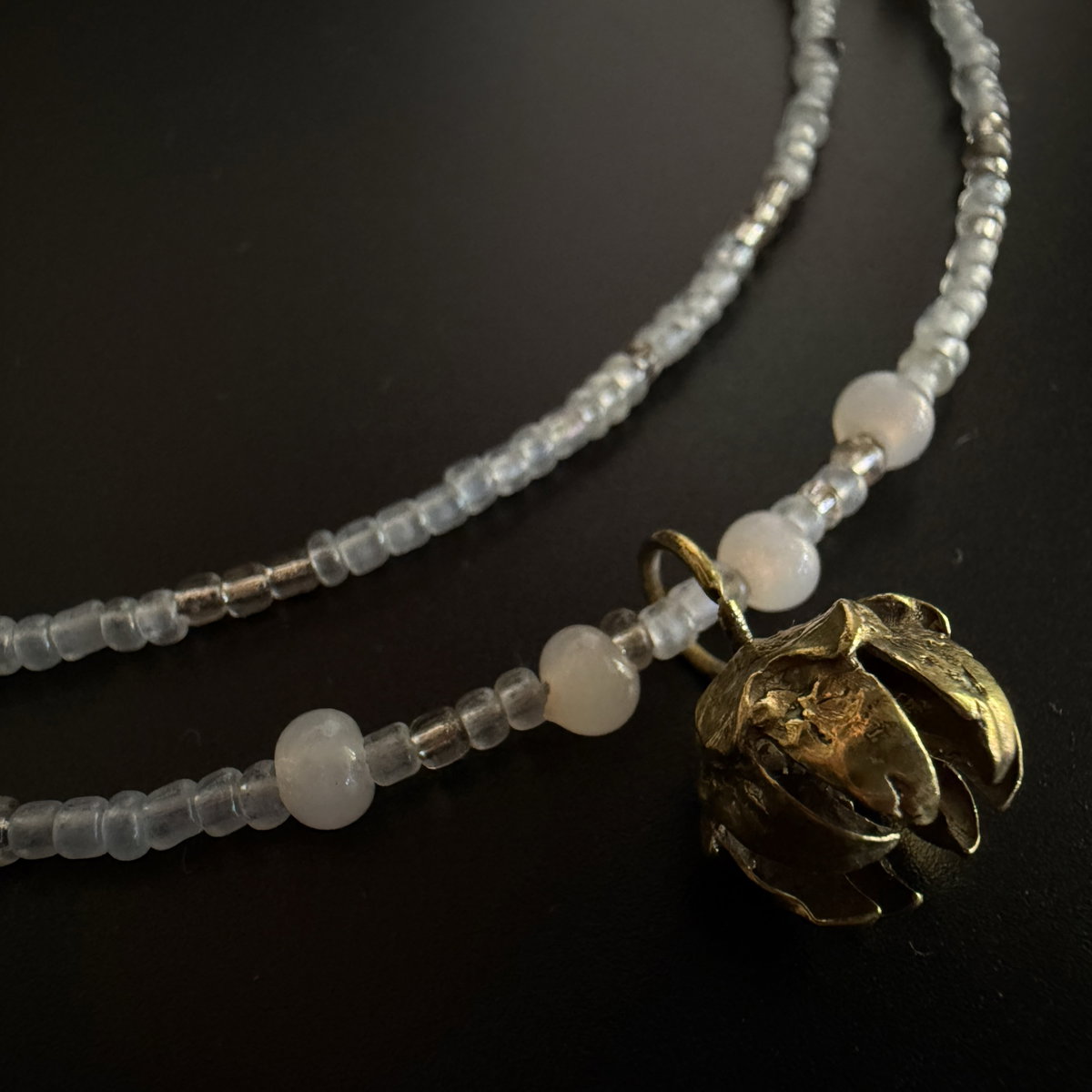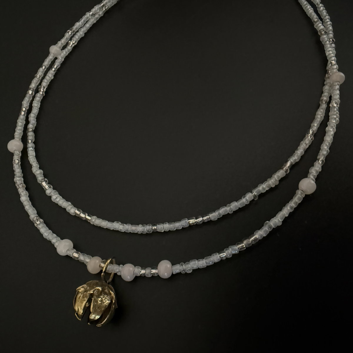 Dos capas de mostacillas y cuentas de vidrio hacen portable este collar.