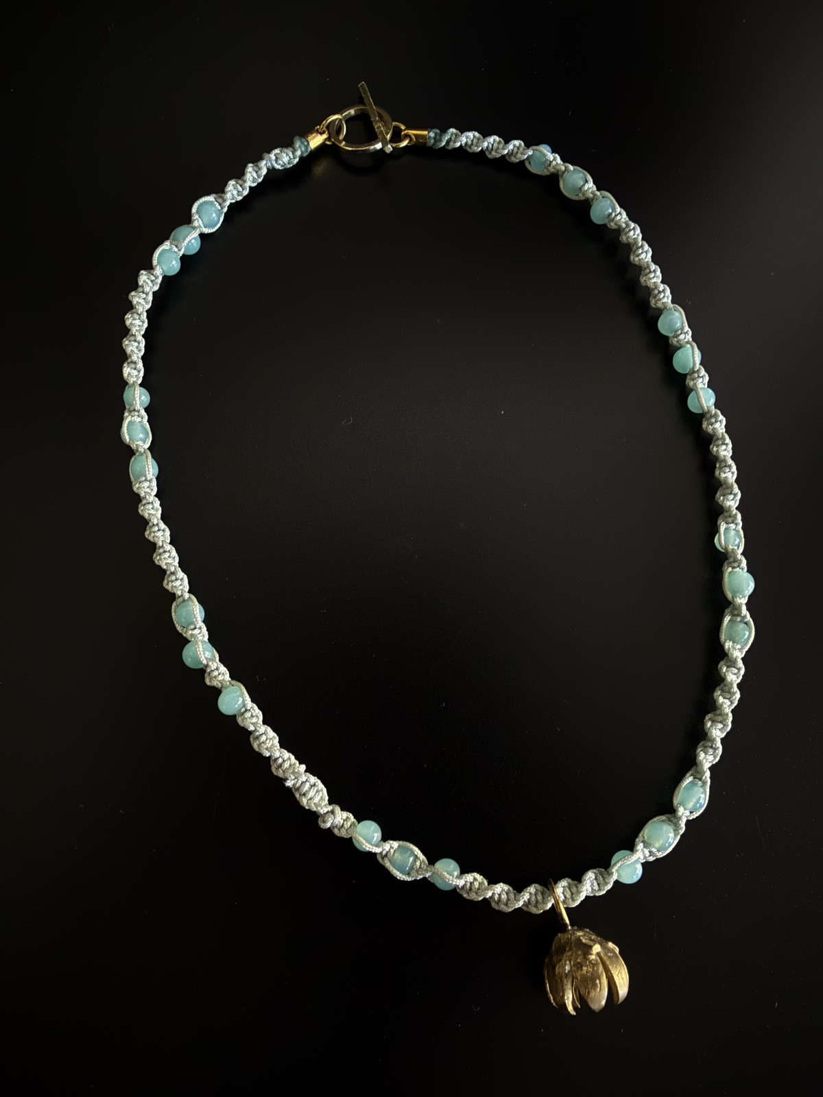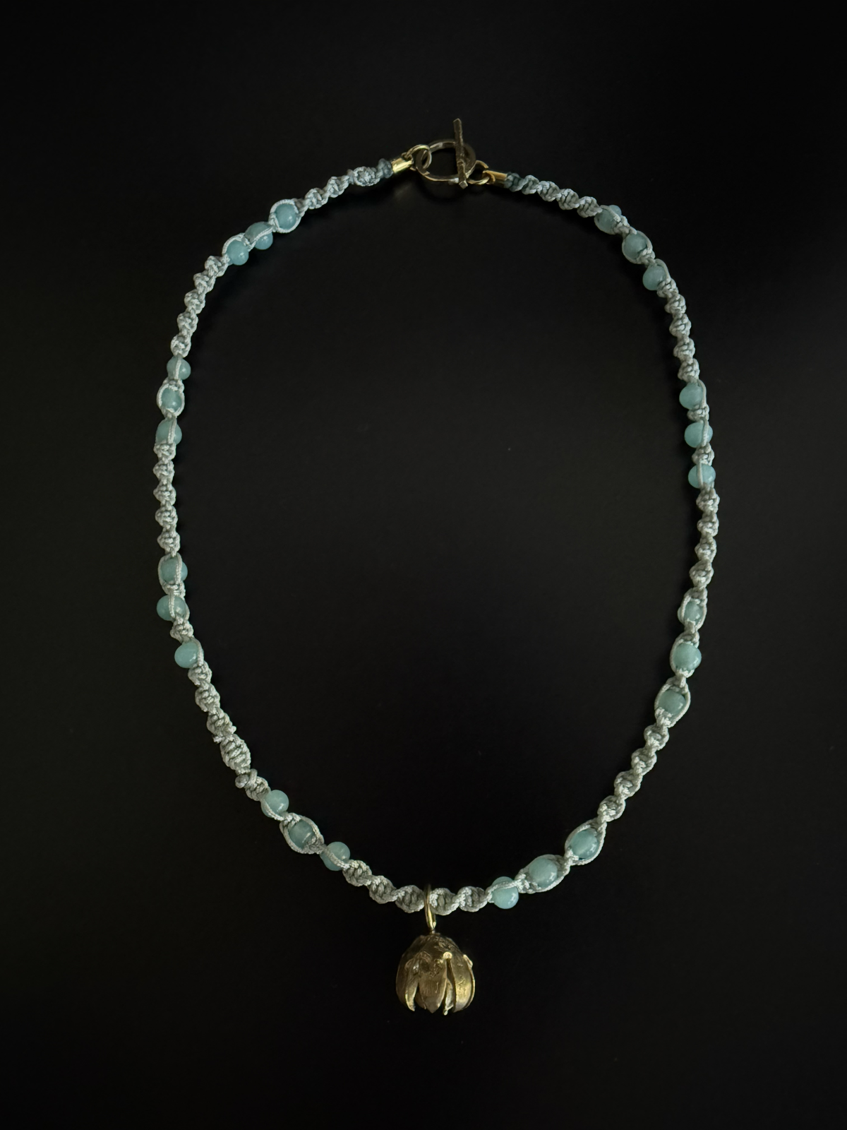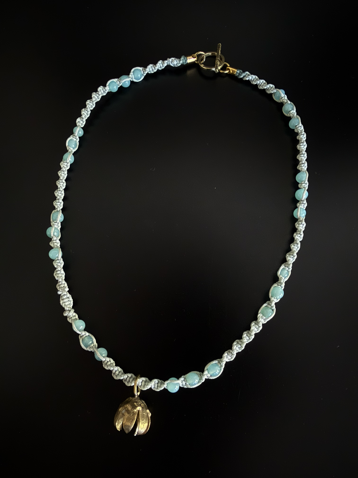 Un liviano y delicado tejido de macramé y cuentas de vidrio hacen portable este collar.
