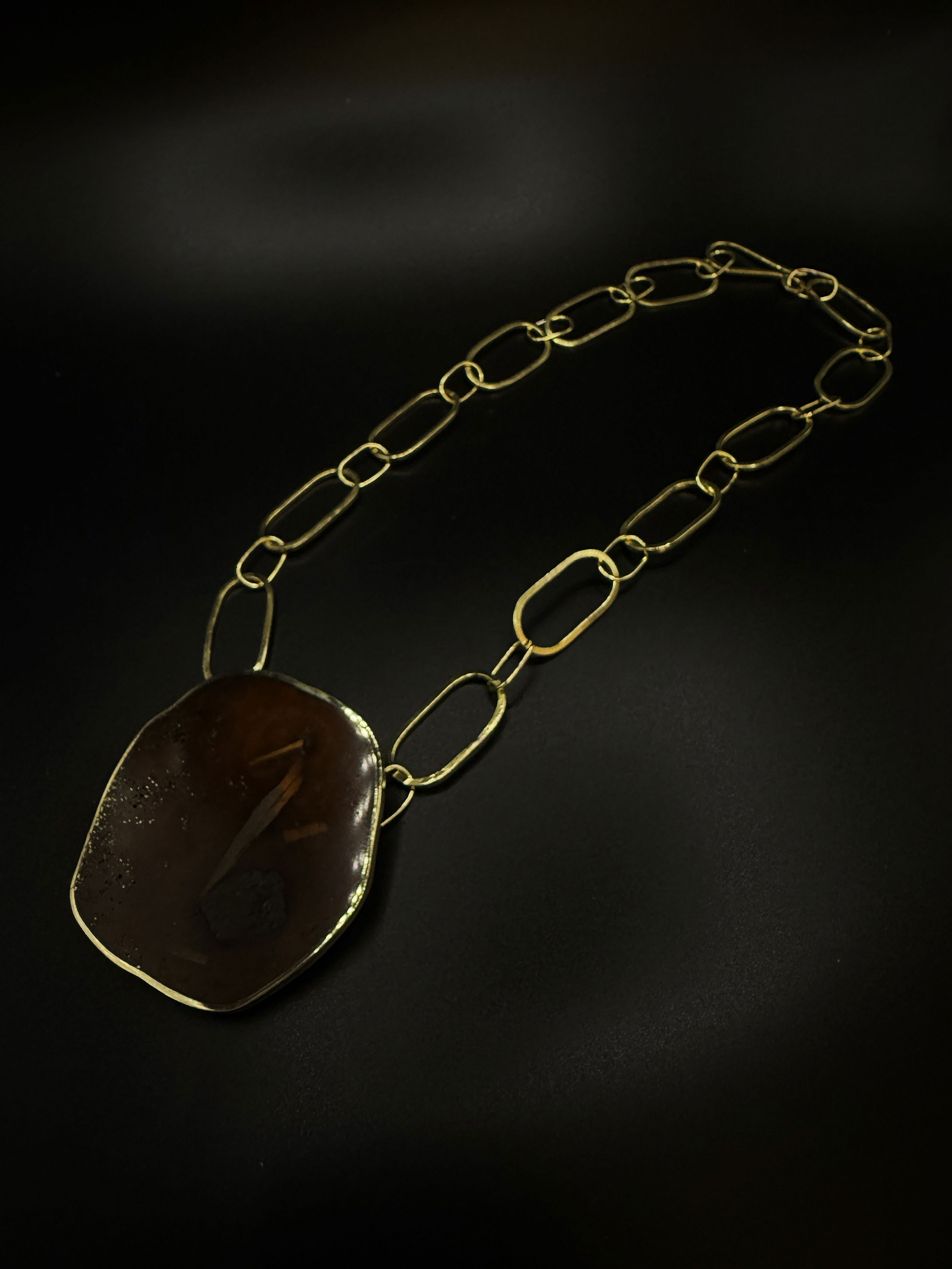 Pieza única hecha a mano en bronce, resina, madera y liquen.