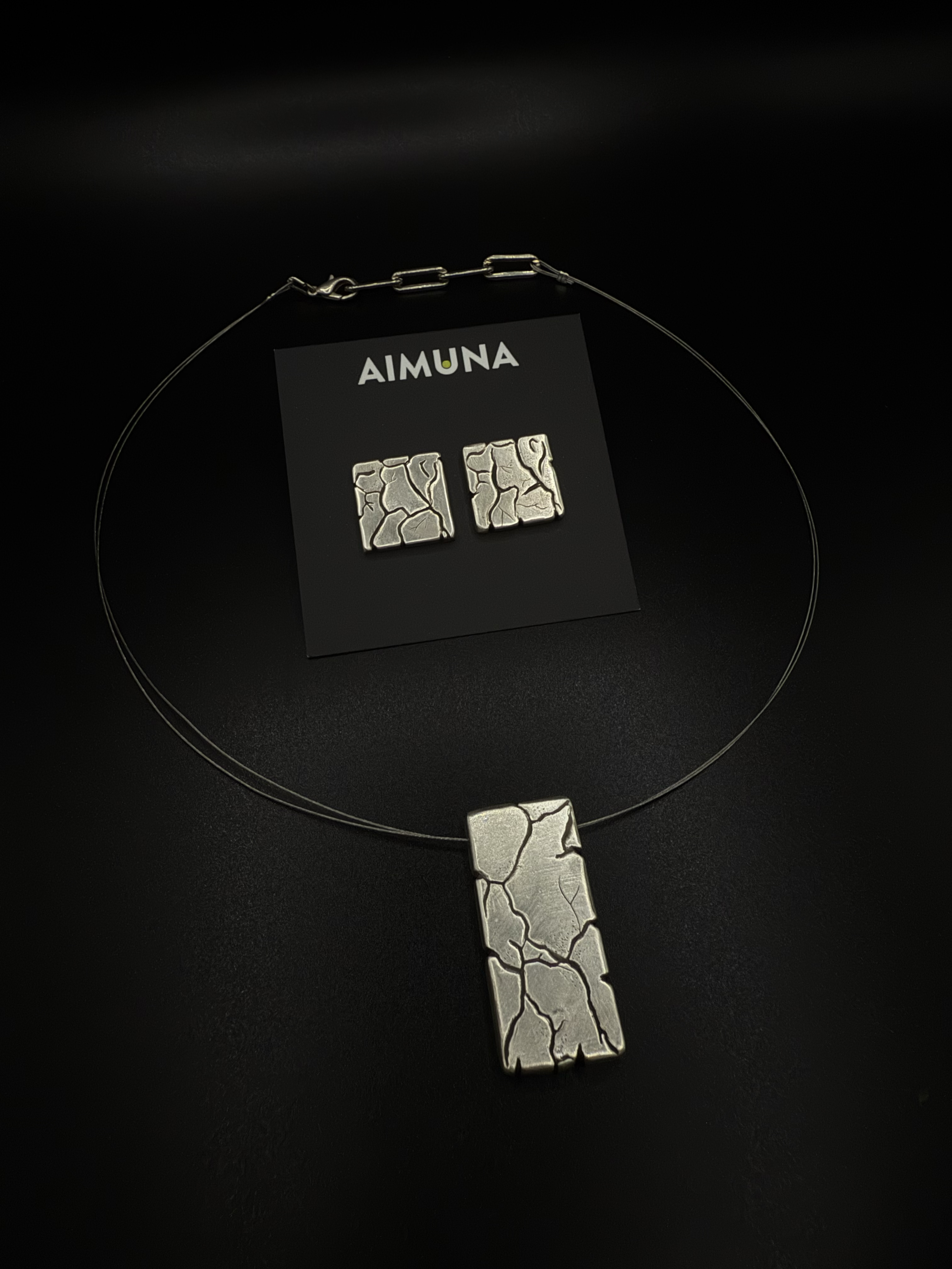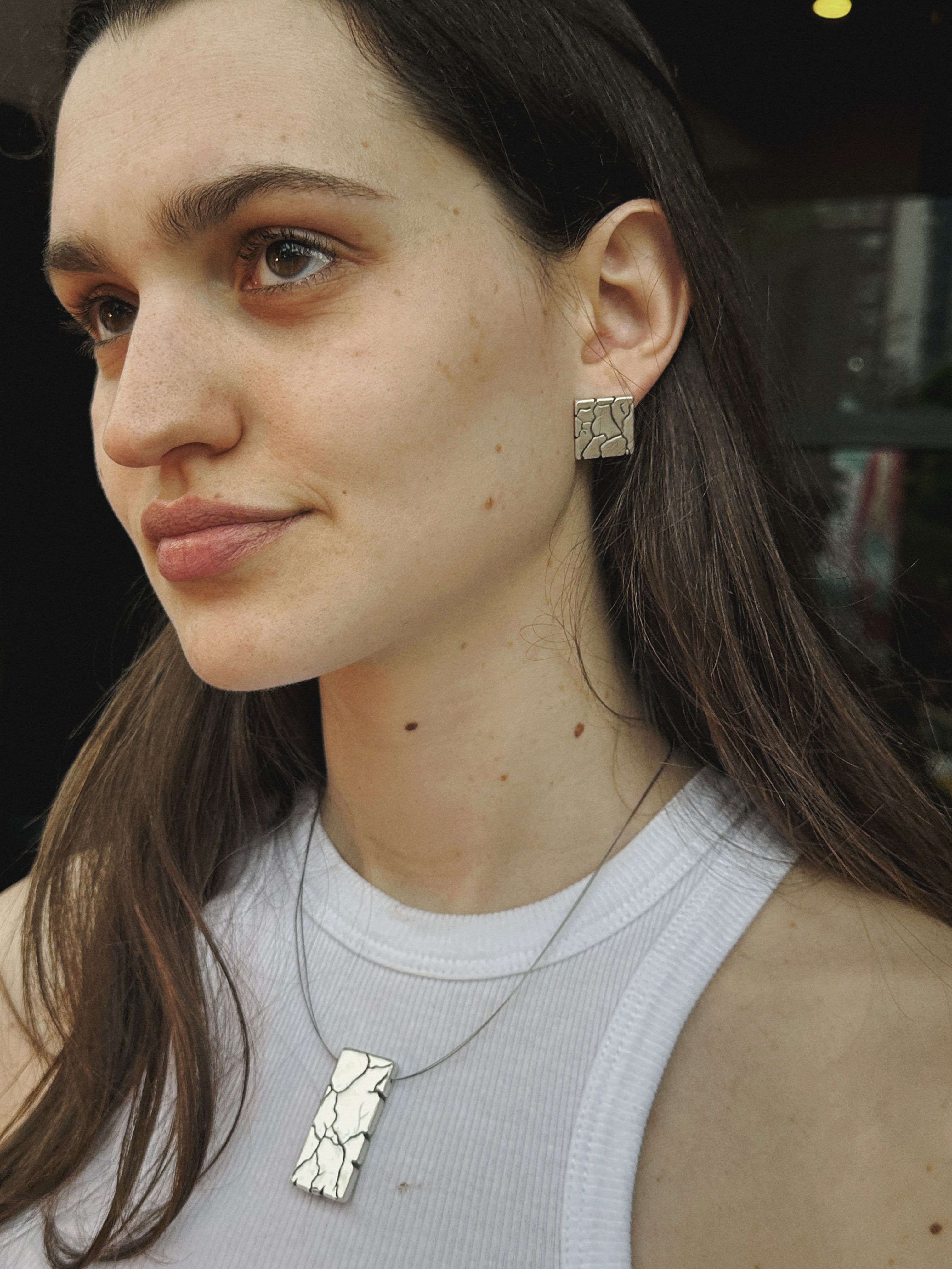 Conjunto Grietas: aros con perno y collar de la colección Cortezas. Ambas piezas están hechas en plata 925.
